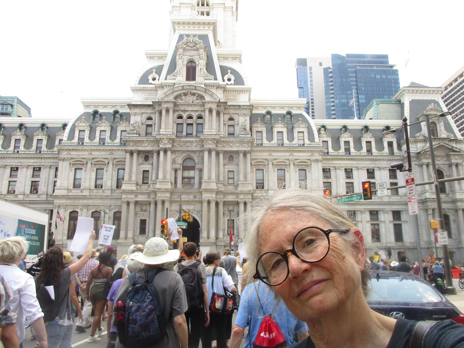 After the protest march, I trudged off through the streets of Philly, just soaking in the ambiance of all that historic “Cradle of Freedom” stuff. At Independence Hall, I met up with my guide for a walking tour of where Black history also took place back during Revolutionary times — and right there in the very center of the Cradle of Liberty itself, our tour group stumbled upon a sweet, idealistic and hopeful group of young middle-school girls, standing next to the very place where John Hancock had signed the Declaration of Independence. And these girls were holding up signs protesting the caging of children in America today.