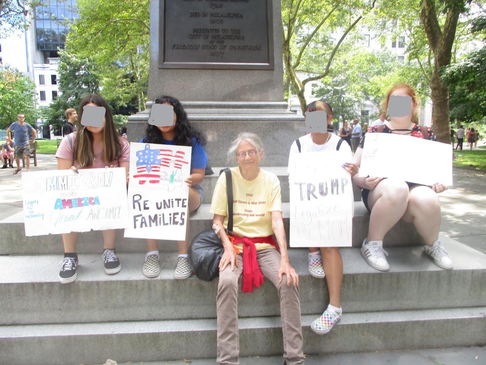 After the protest march, I trudged off through the streets of Philly, just soaking in the ambiance of all that historic “Cradle of Freedom” stuff. At Independence Hall, I met up with my guide for a walking tour of where Black history also took place back during Revolutionary times — and right there in the very center of the Cradle of Liberty itself, our tour group stumbled upon a sweet, idealistic and hopeful group of young middle-school girls, standing next to the very place where John Hancock had signed the Declaration of Independence. And these girls were holding up signs protesting the caging of children in America today.